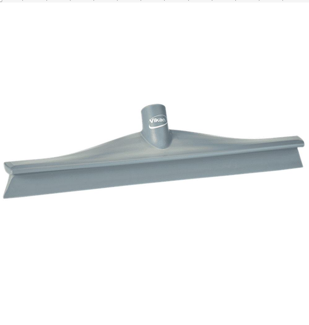 DESCRIPTION: One-piece design and co-molded construction eliminates areas that could harbor bacteria. Specially blended rubber blade retains its flexibility and durability and is useful on a variety of work surfaces. Reinforced polypropylene head. Made from FDA-compliant materials. This ultra-hygienic squeegee combines ultimate hygiene with effective water removal from walls, floors and tables. The angled blade makes it easy to remove water from corners and other difficult-to-reach areas, and the splash guard ensures that liquid does not spill onto the dried surface.